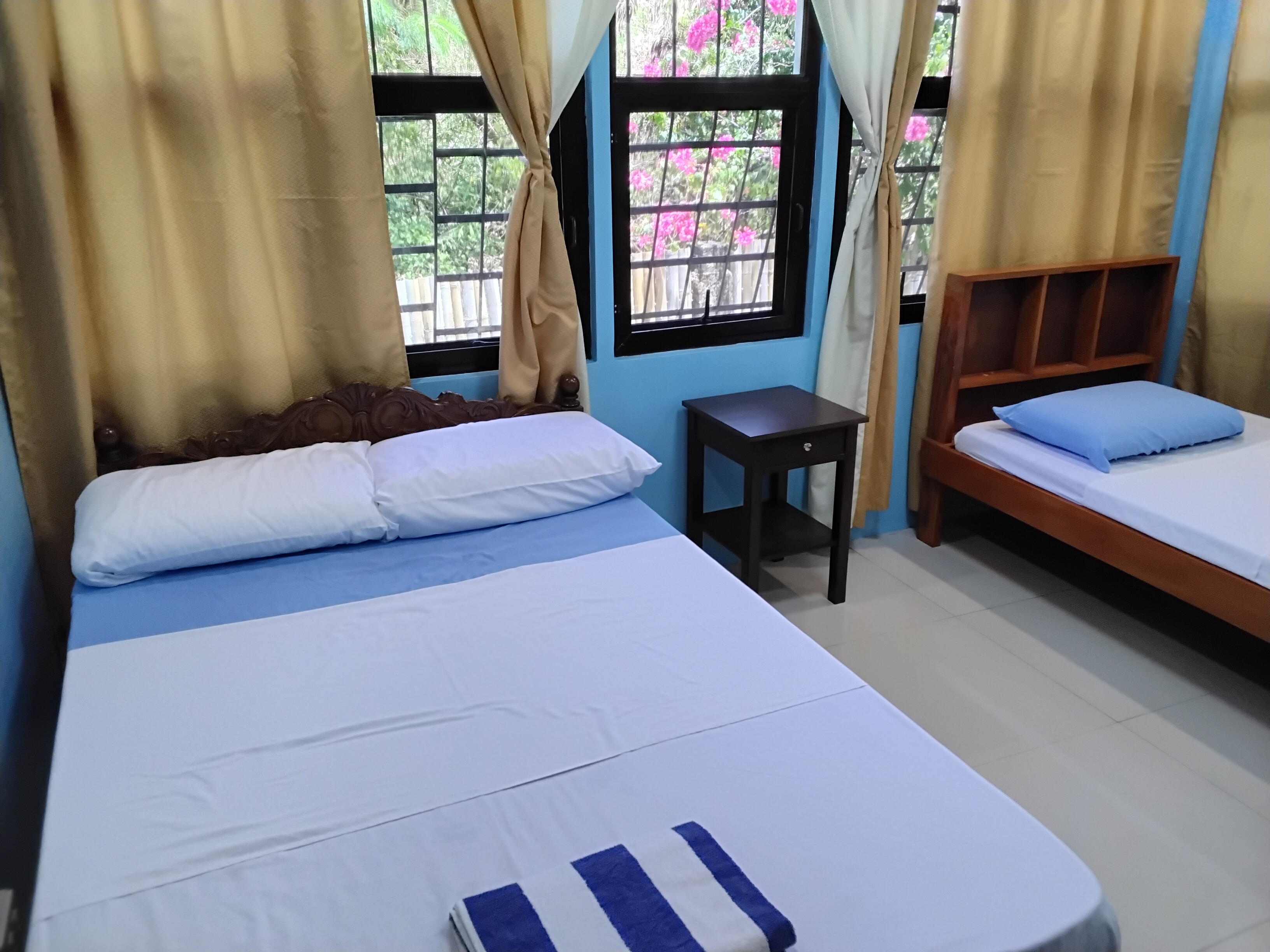 Each bedroom has an air-conditioner, wall fan, and storage cabinet.